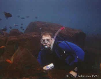 Jerry Draper poses for a picture, with some female Metriclima estherae to his right. Male Metriclima estherae (light blue, no stripes) are sparring. As you can see the water clarity is very good.
