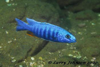 Metriclima zebra here at this location are a nice blue black with yellow tipped dorsal fin and caudal. This was my first time photographing Aulonocara maylandi, and there were lots of them.